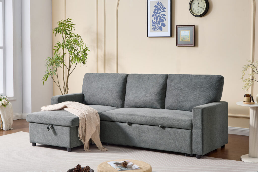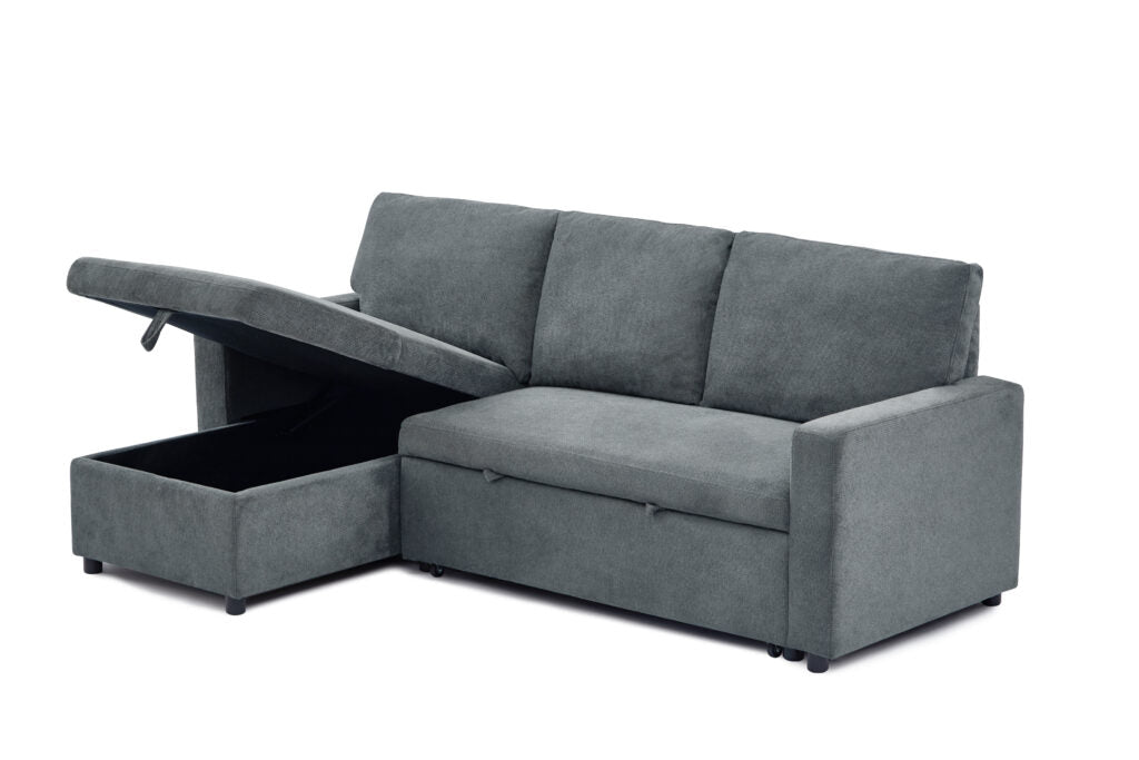 Upholstered in stylish grey woven fabric, this multifunctional piece features a reversible corner layout and built-in chaise storage. It seamlessly converts into a generous guest bed, making it a smart solution for space conscious living.