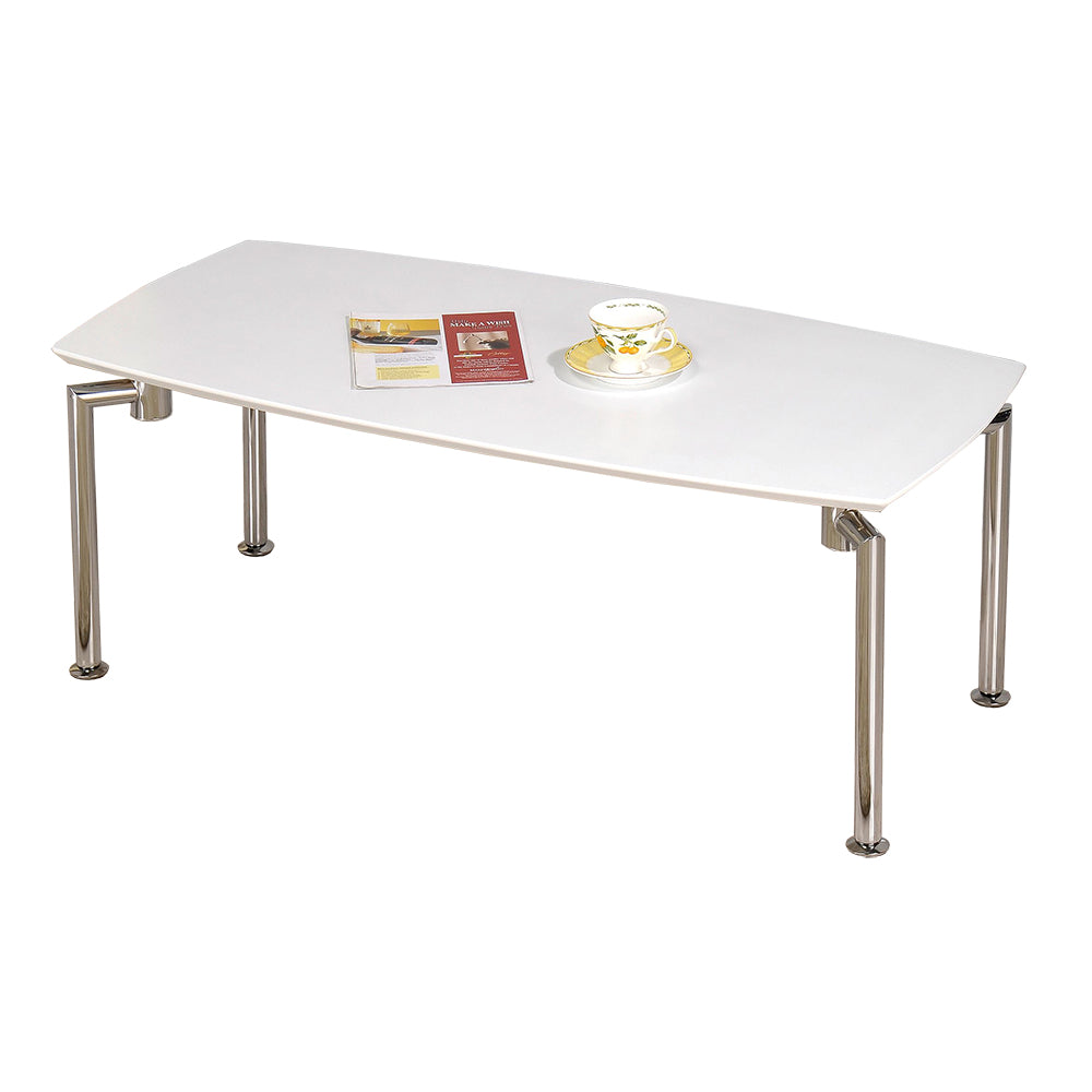 The Dove Coffee Table is a clean, white table with modern chrome finished legs. The table is made from a lacquered white wood.