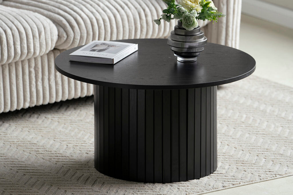 Elevate your living space with the Hoxton Fluted Round Coffee Table in Black – a fusion of modern sophistication and eye-catching design. This luxurious table is finished in a captivating matt black, creating a bold statement in any room. The round base features striking fluted detail, adding a touch of texture and visual interest. The large surface provides ample space for both decorative displays and practical use.